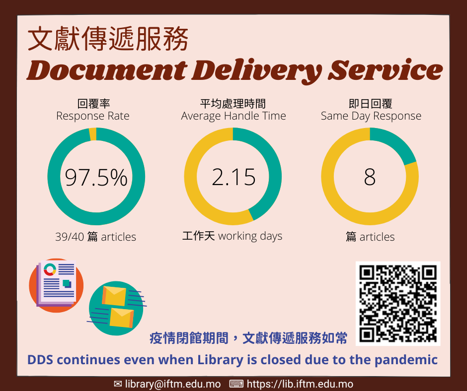 DDS continues even when Library is closed due to the pandemic. Since 18 June, Library has received 40 requests, of which 39 have been fulfilled. The response rate is 97.5% and the average handle time is 2.15 days. For 8 articles, we are able to reply within the same day.
