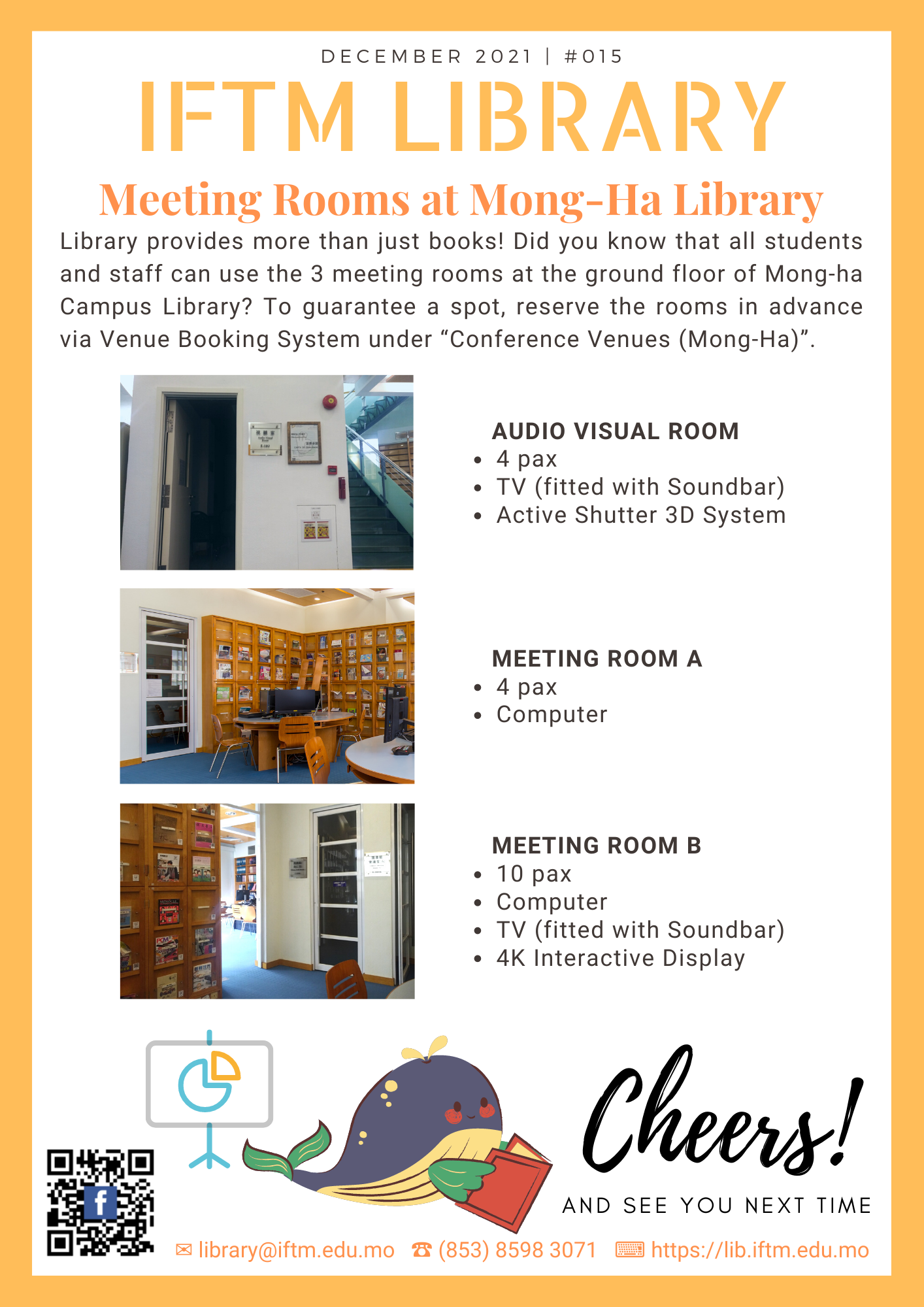 Library provides more than just books! Did you know that all students and staff can use the 3 meeting rooms at the ground floor of Mong-ha Campus Library? To guarantee a spot, reserve the rooms in advance via Venue Booking System under “Conference Venues (Mong-Ha)”.