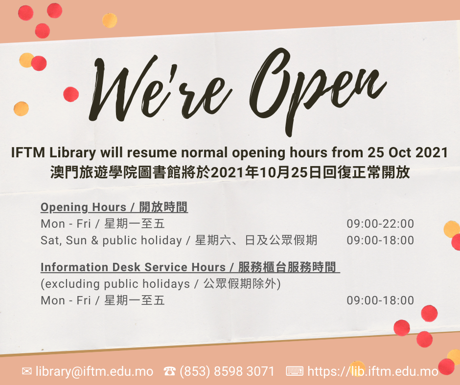 IFTM Library will resume normal opening hours from 25 Oct 2021. Please remember to: