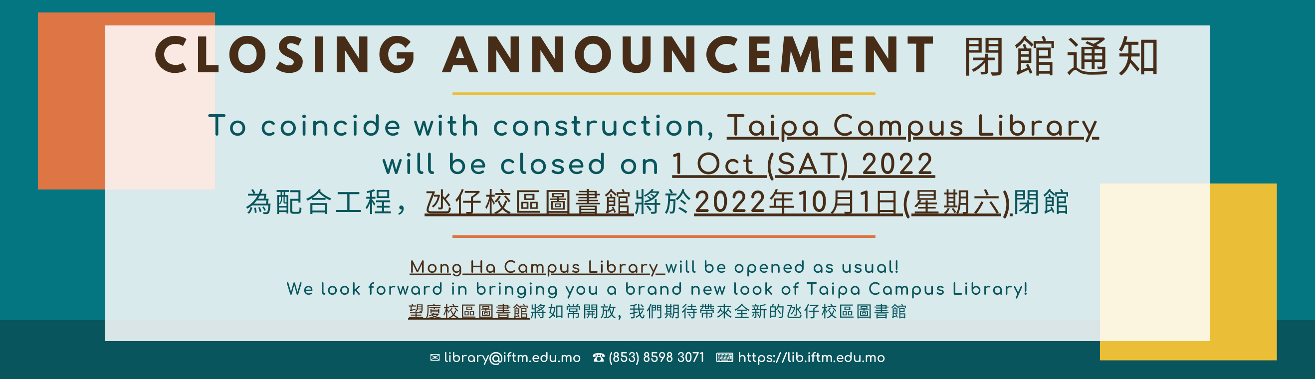 The Taipa Campus Library is scheduled to close 1 Oct 2022 for some renovation work.