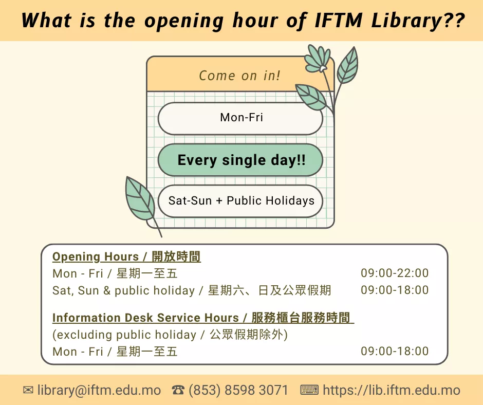 Need a quiet space to study for your exams? We’ve got your backs! IFTM Library is open every single day, including weekends and public holidays.